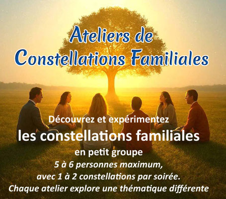 Venez découvrir, expérimenter ou participer à des ateliers de constellations familiales en petit groupe (5 à 6 personnes au maximum avec 1 à 2 constellations par soirée). Chaque atelier portera sur une thématique différente.